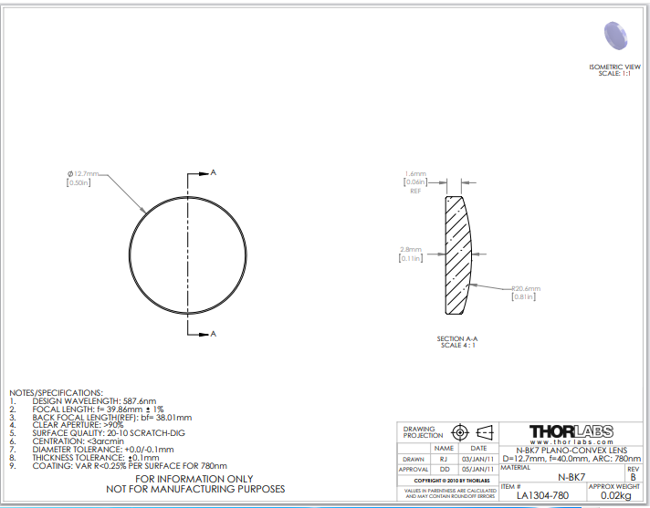 Thorlabs索雷博    LA1304-780   平凸透镜