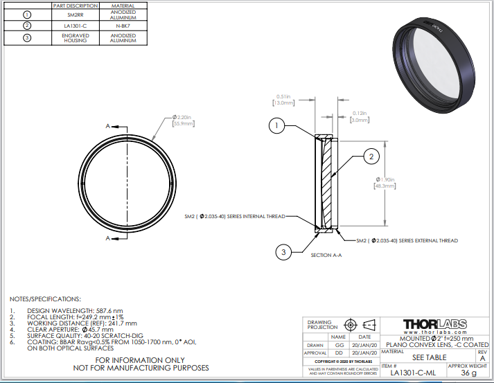 Thorlabs索雷博    LA1301-C-ML   平凸透镜