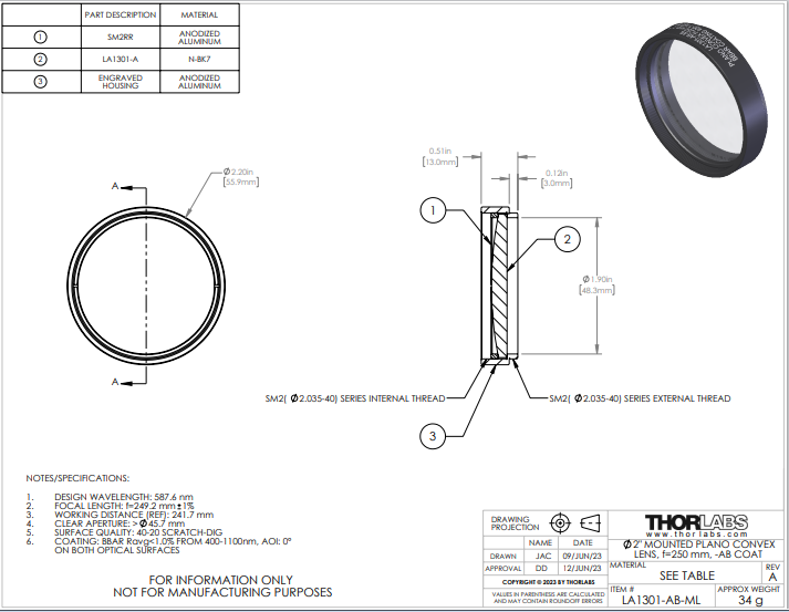 Thorlabs索雷博 LA1301-AB-ML 平凸透镜