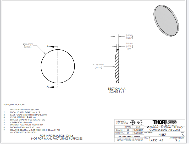 Thorlabs索雷博 LA1301-AB 平凸透镜