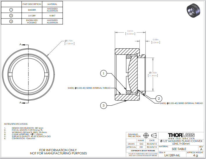 Thorlabs索雷博 LA1289-ML 平凸透镜