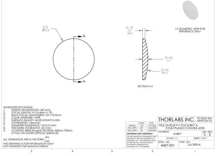 Thorlabs索雷博 LA1399-A 平凸透镜