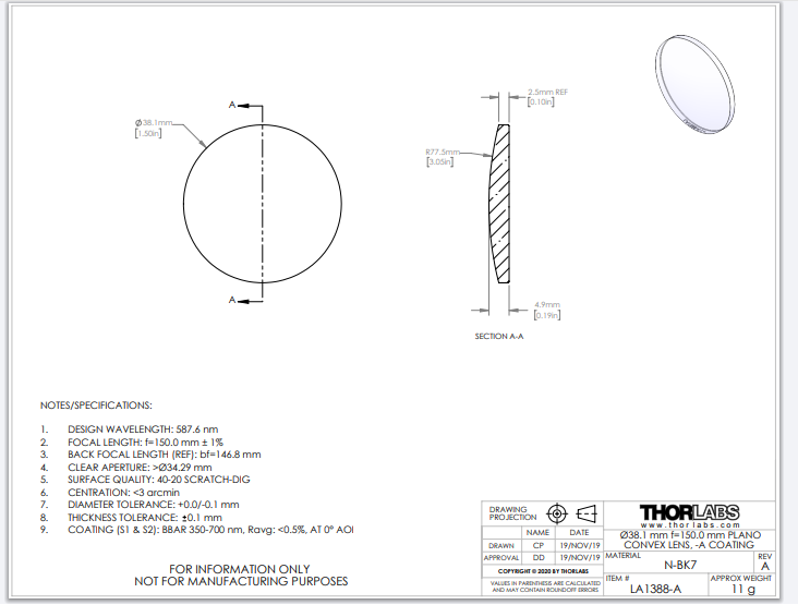 Thorlabs索雷博 LA1388-A 平凸透镜