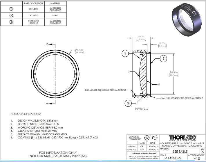 Thorlabs索雷博 LA1387-C-ML 平凸透镜