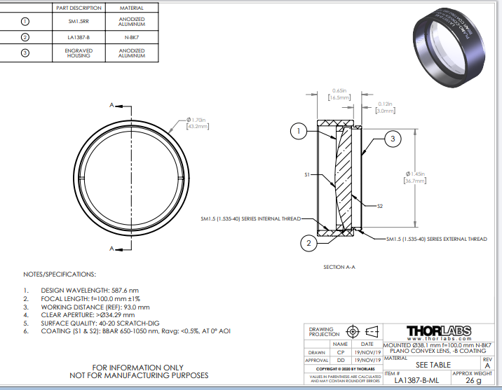 Thorlabs索雷博 LA1387-B-ML 平凸透镜
