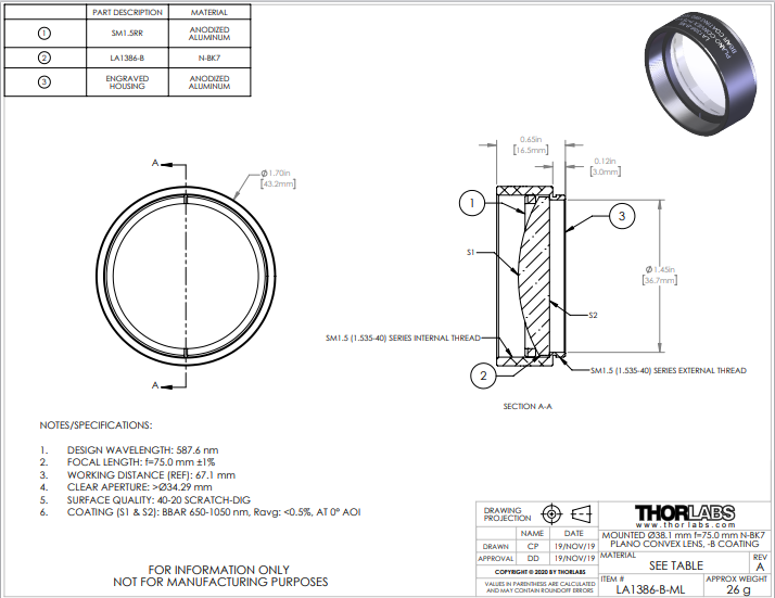 Thorlabs索雷博 LA1386-B-ML 平凸透镜