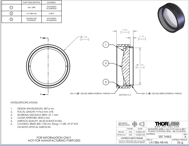 Thorlabs索雷博 LA1386-AB-ML 平凸透镜