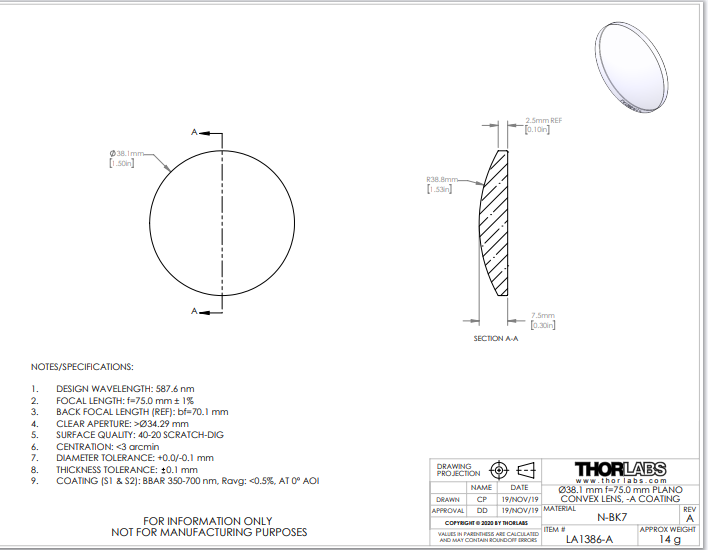 Thorlabs索雷博    LA1386-A   平凸透镜