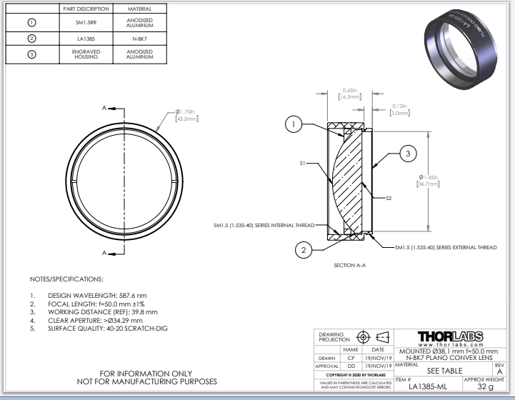 Thorlabs索雷博 LA1385-ML 平凸透镜