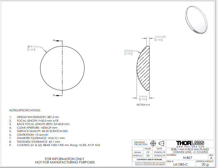 Thorlabs索雷博 LA1385-C 平凸透镜