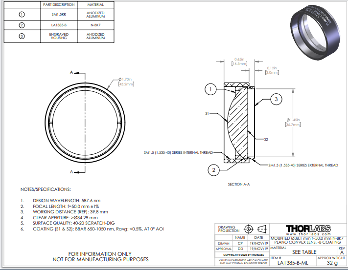 Thorlabs索雷博 LA1385-B-ML 平凸透镜
