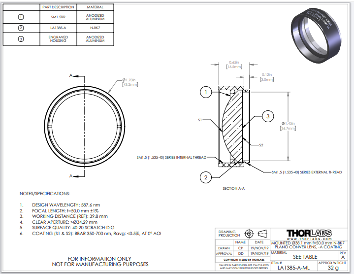 Thorlabs索雷博 LA1385-A-ML 平凸透镜