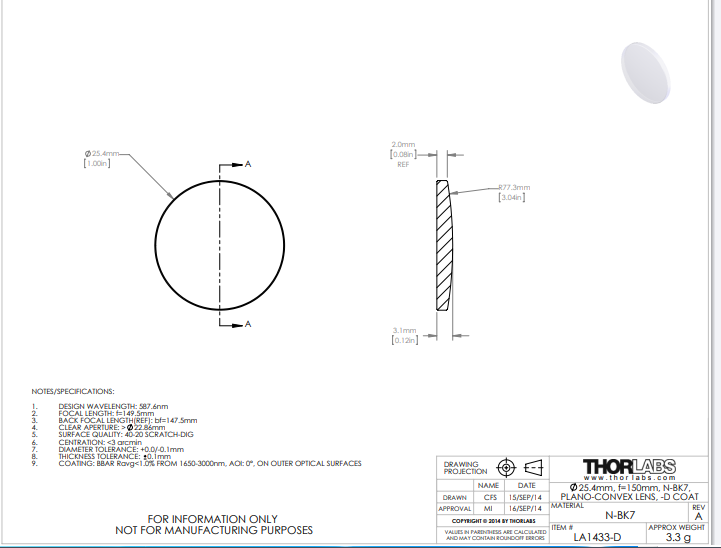 Thorlabs索雷博 LA1433-D 平凸透镜