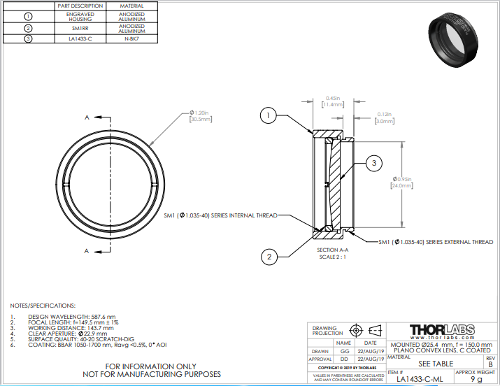 Thorlabs索雷博    LA1433-C-ML   平凸透镜