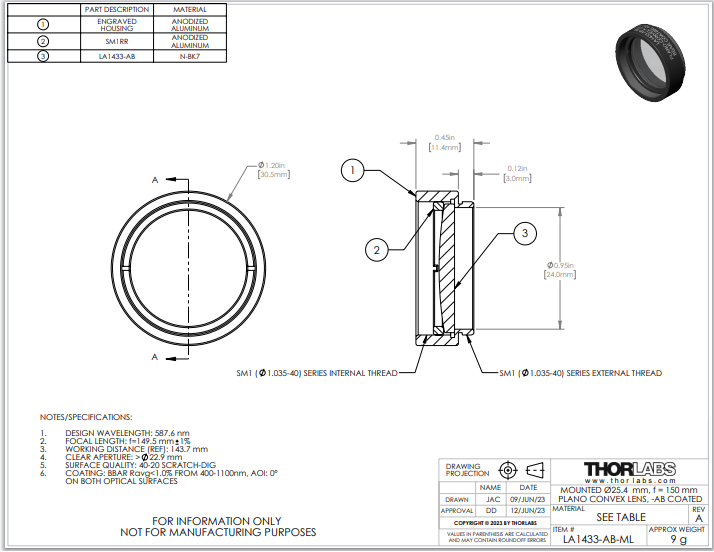Thorlabs索雷博    LA1433-AB-ML   平凸透镜
