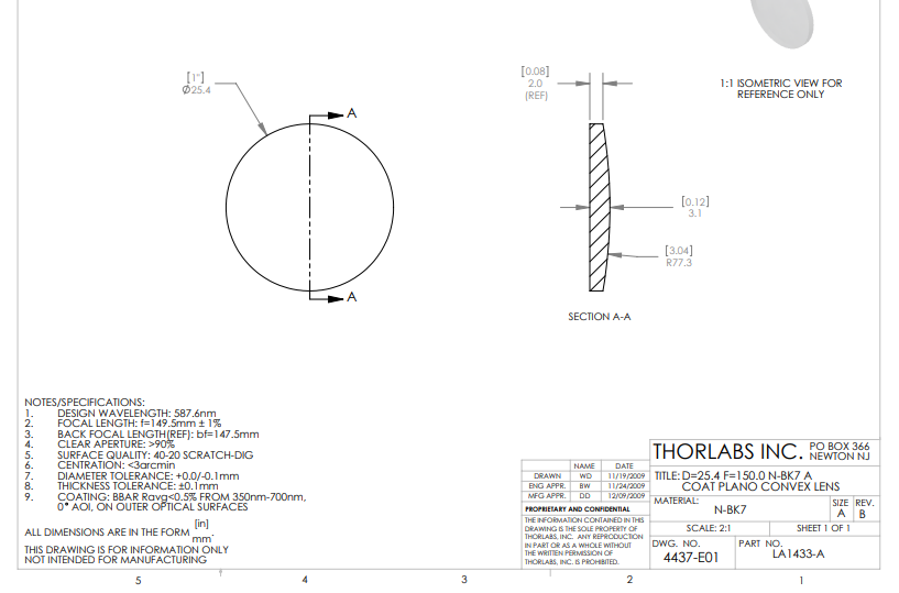 Thorlabs索雷博    LA1433-A   平凸透镜
