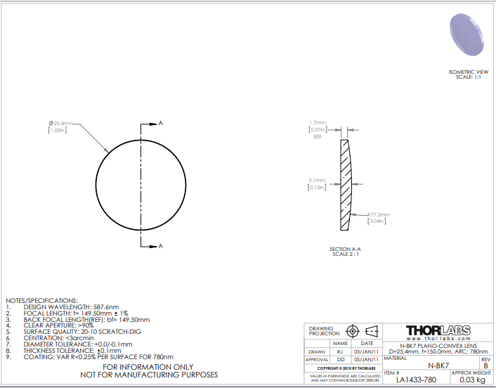 Thorlabs索雷博 LA1433-780 平凸透镜