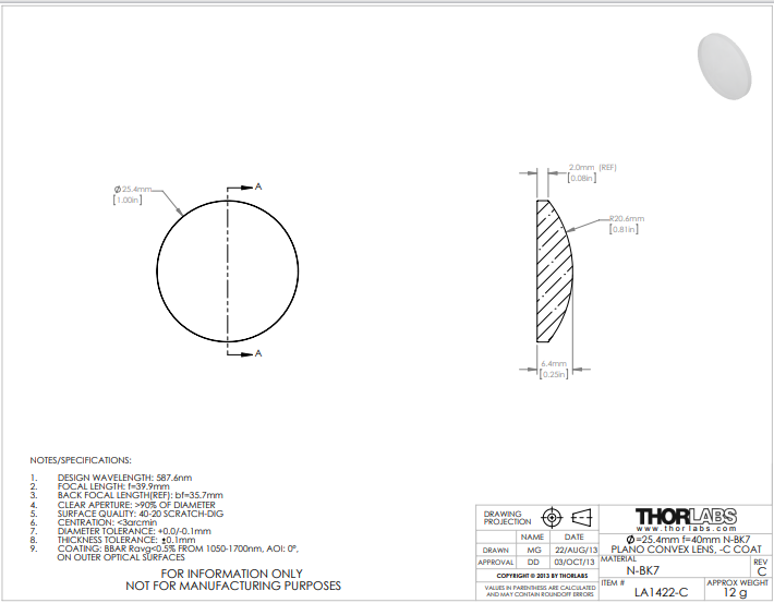 Thorlabs索雷博    LA1422-C   平凸透镜