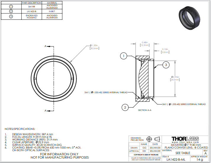 Thorlabs索雷博 LA1422-B-ML 平凸透镜