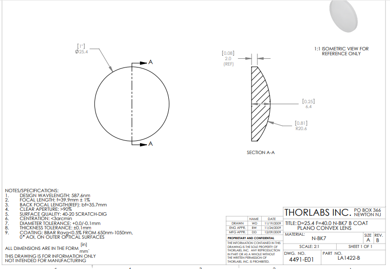 Thorlabs索雷博 LA1422-B 平凸透镜