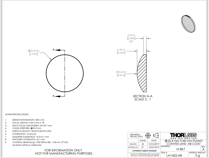 Thorlabs索雷博 LA1422-AB 平凸透镜