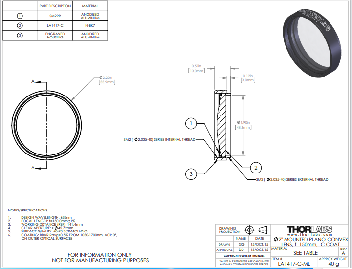 Thorlabs索雷博    LA1417-C-ML   平凸透镜
