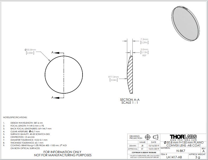 Thorlabs索雷博    LA1417-AB   平凸透镜