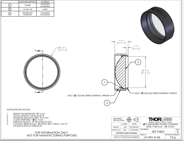 Thorlabs索雷博 LA1401-AB-ML 平凸透镜