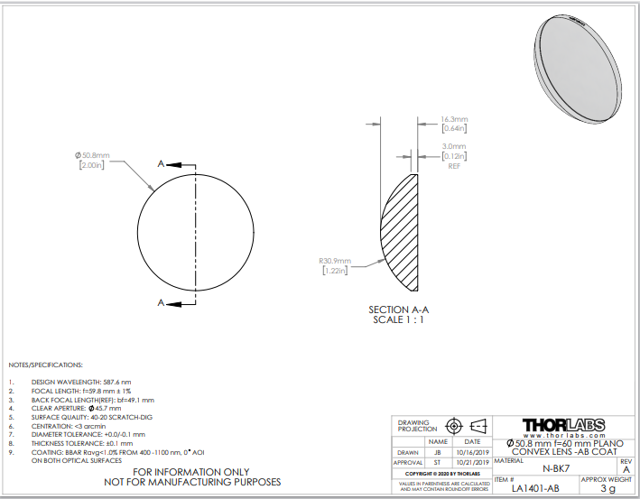 Thorlabs索雷博    LA1401-AB   平凸透镜