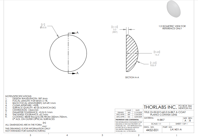 Thorlabs索雷博    LA1401-A   平凸透镜