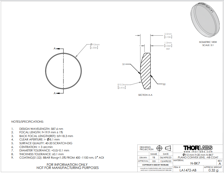 Thorlabs索雷博 LA1472-AB 平凸透镜