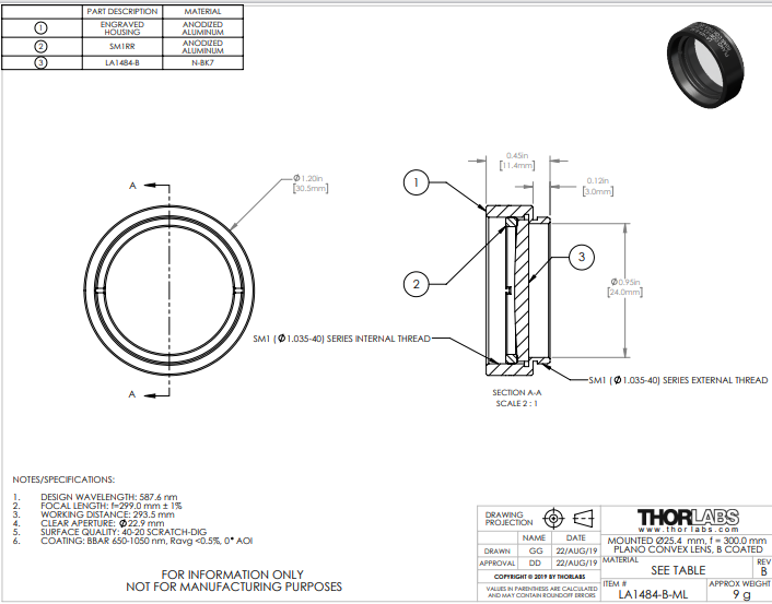 Thorlabs索雷博 LA1484-B-ML 平凸透镜