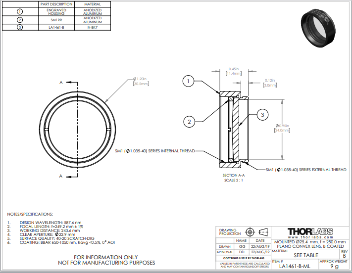 Thorlabs索雷博 LA1461-B-ML 平凸透镜