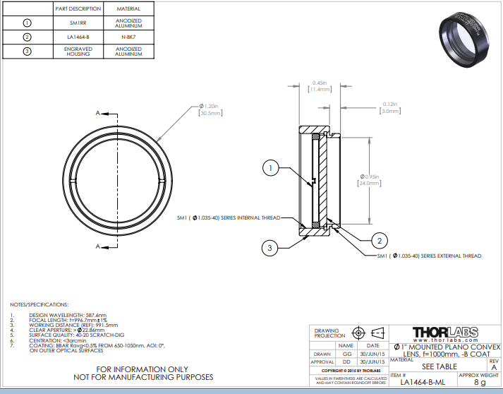 Thorlabs索雷博 LA1464-B-ML 平凸透镜