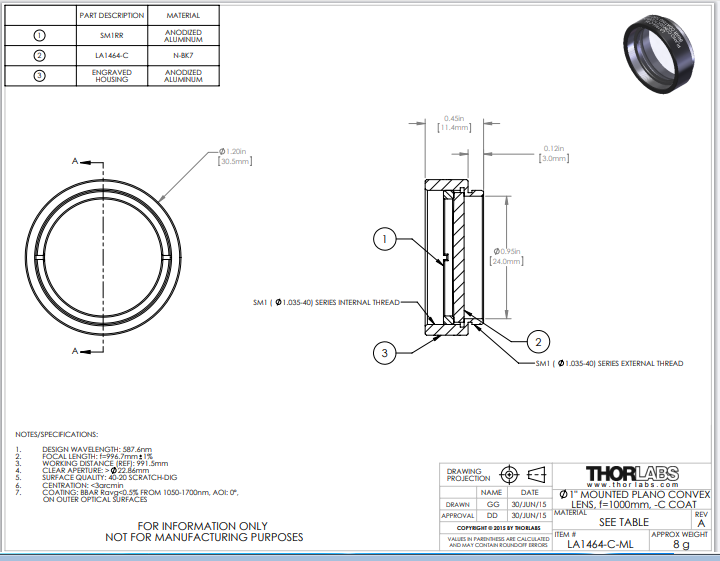 Thorlabs索雷博 LA1464-C-ML 平凸透镜