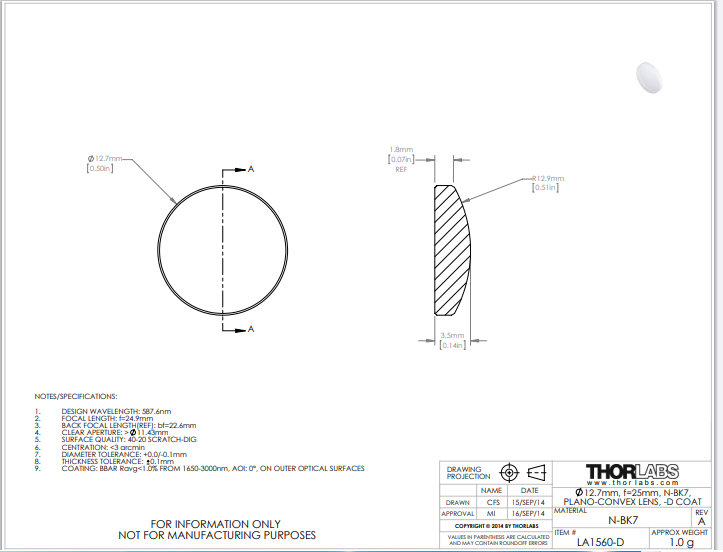 Thorlabs索雷博    LA1560-D   平凸透镜