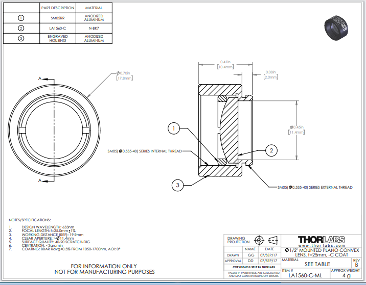 Thorlabs索雷博    LA1560-C-ML   平凸透镜
