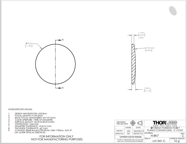 Thorlabs索雷博 LA1541-C 平凸透镜