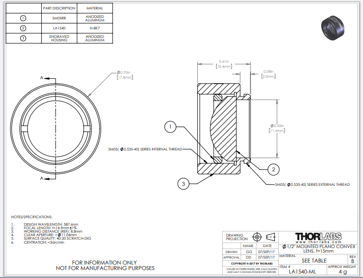 Thorlabs索雷博 LA1540-ML 平凸透镜
