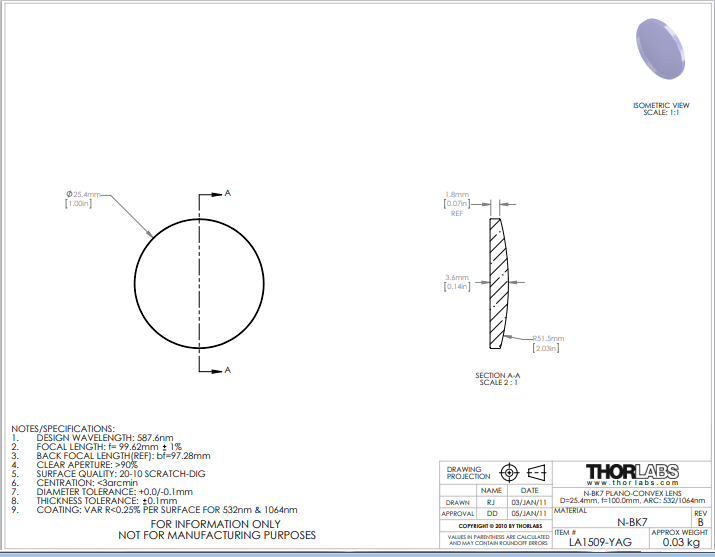 Thorlabs索雷博 LA1509-YAG 平凸透镜
