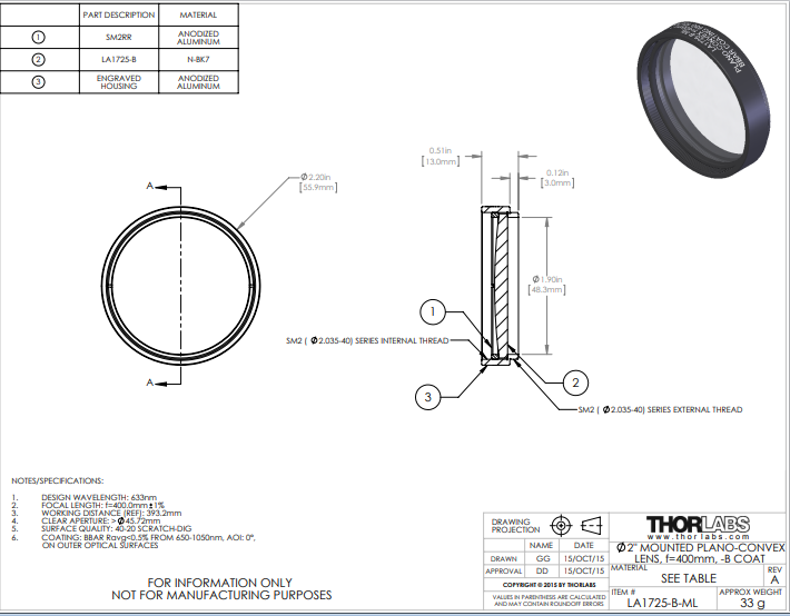 Thorlabs索雷博 LA1725-B-ML 平凸透镜