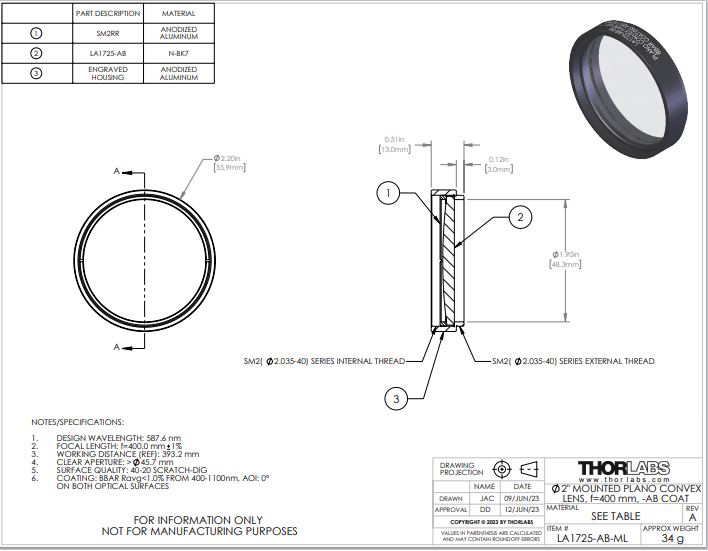 Thorlabs索雷博    LA1725-AB-ML   平凸透镜