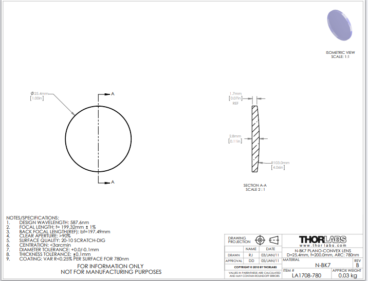Thorlabs索雷博    LA1708-780   平凸透镜