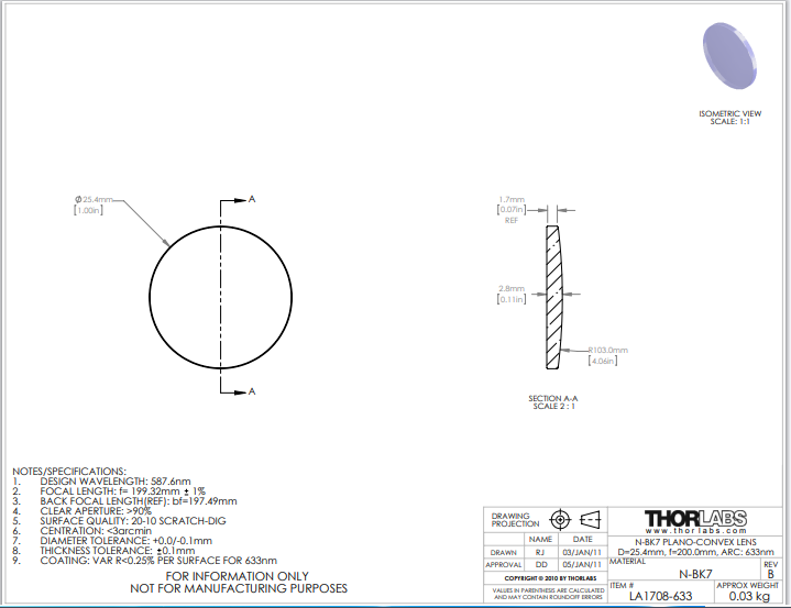 Thorlabs索雷博 LA1708-633 平凸透镜