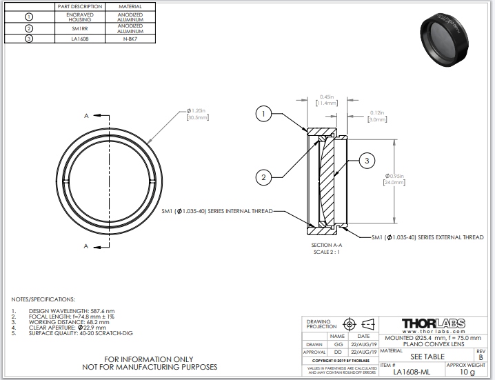 Thorlabs索雷博 LA1608-ML 平凸透镜