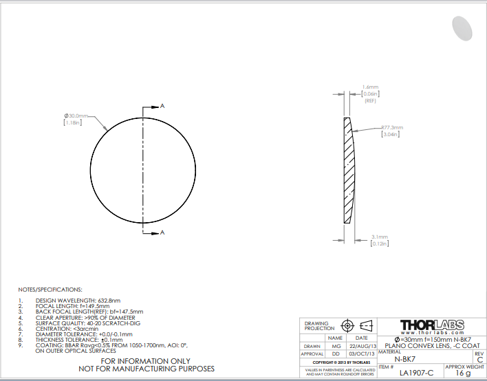 Thorlabs索雷博    LA1907-C   平凸透镜