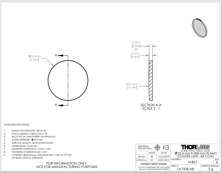 Thorlabs索雷博 LA1908-AB 平凸透镜