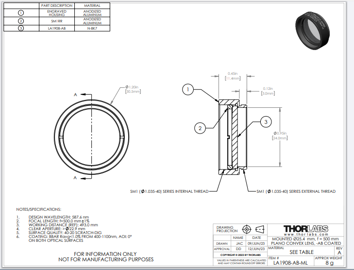 Thorlabs索雷博 LA1908-AB-ML 平凸透镜