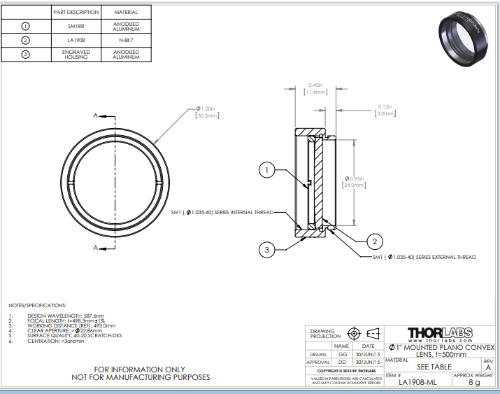 Thorlabs索雷博 LA1908-ML 平凸透镜