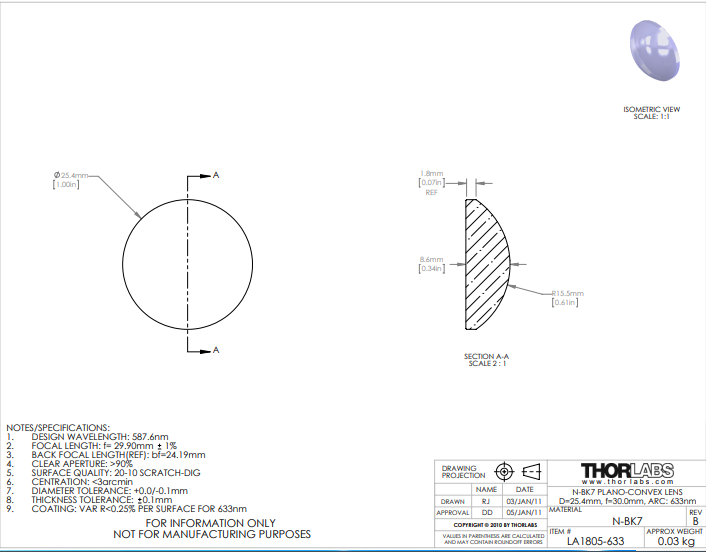 Thorlabs索雷博    LA1805-633   平凸透镜